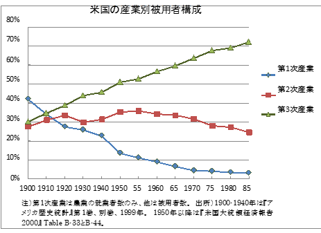 これらの特性因子理論などの「マッチング理論」が提唱される少し以前の1900年のアメリカは、農業などの一次産業の割合が高く(約42%)、フォードの自動車工場に代表されるような工場におけるラインでの組み立ての仕事(二次産業 約28%)と現在のようなサービス業(3次産業 約29%)の割合は一次産業に比べて低いものでした。しかし、現在においてはサービス産業が圧倒的な主流を占めています(1985年時点ですでに70%以上)。