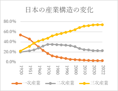 日本の場合も概ね同じような傾向です。1920年時点で一次産業従事者の割合は約54%、二次産業は約20%、三次産業が22%であるのに対して、2022年時点で一次産業はたったの3%、二次産業は約23%、三次産業は約74%と劇的に三次産業の比率が伸びています。